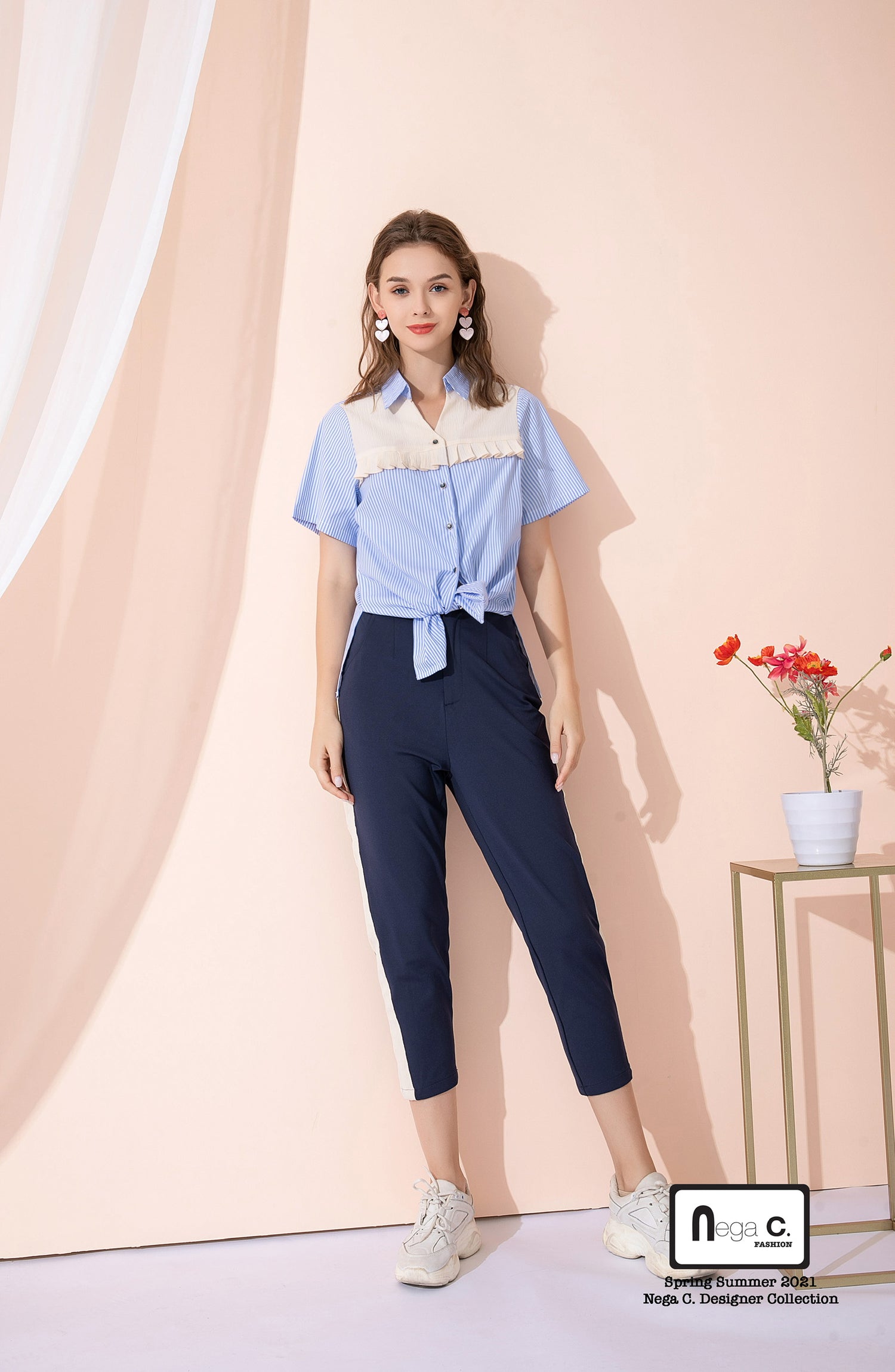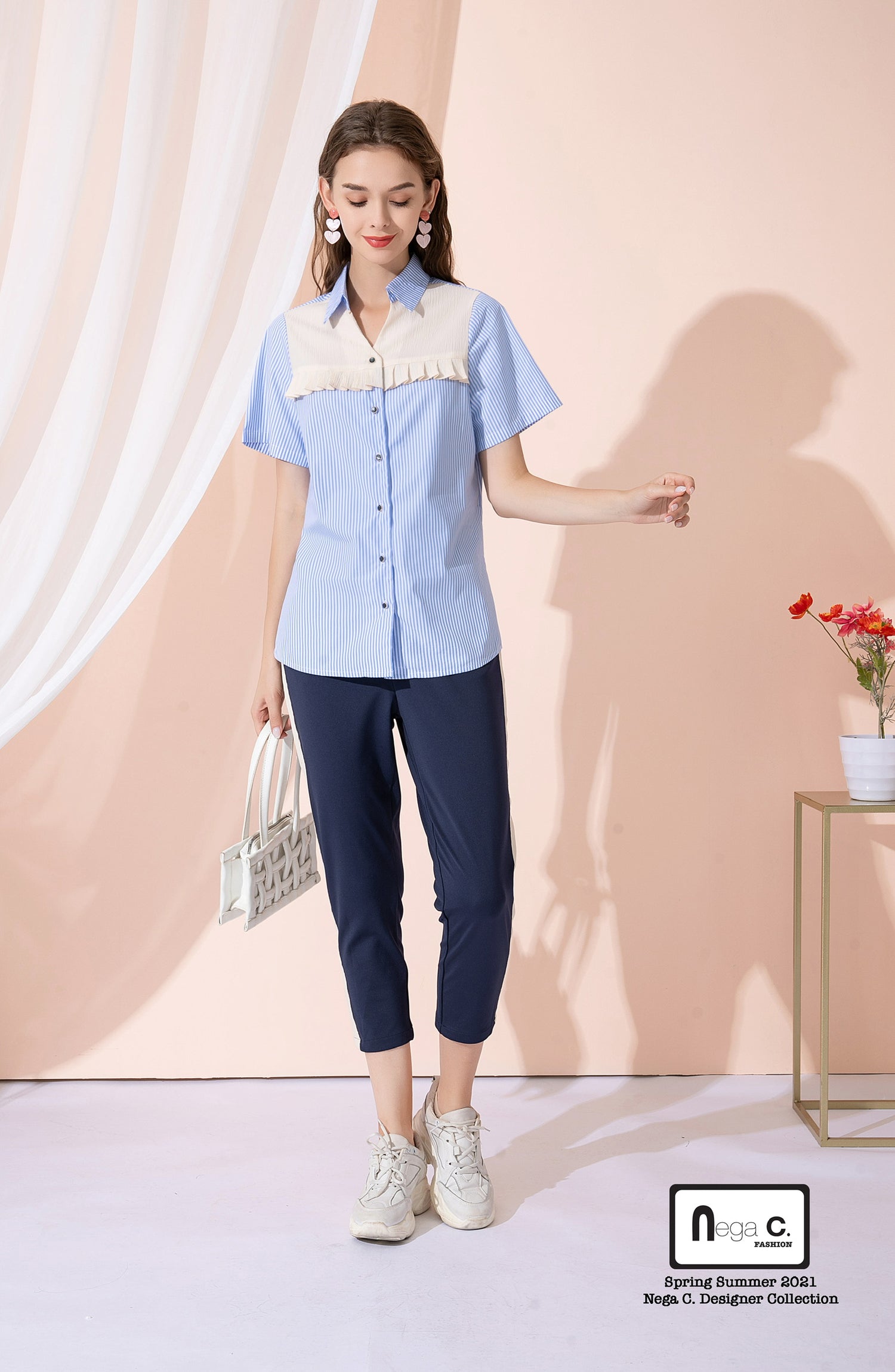 Nega C.เสื้อเชิ้ตคัลเลอร์บล็อคตัวยาว | ฟ้าอ่อน |